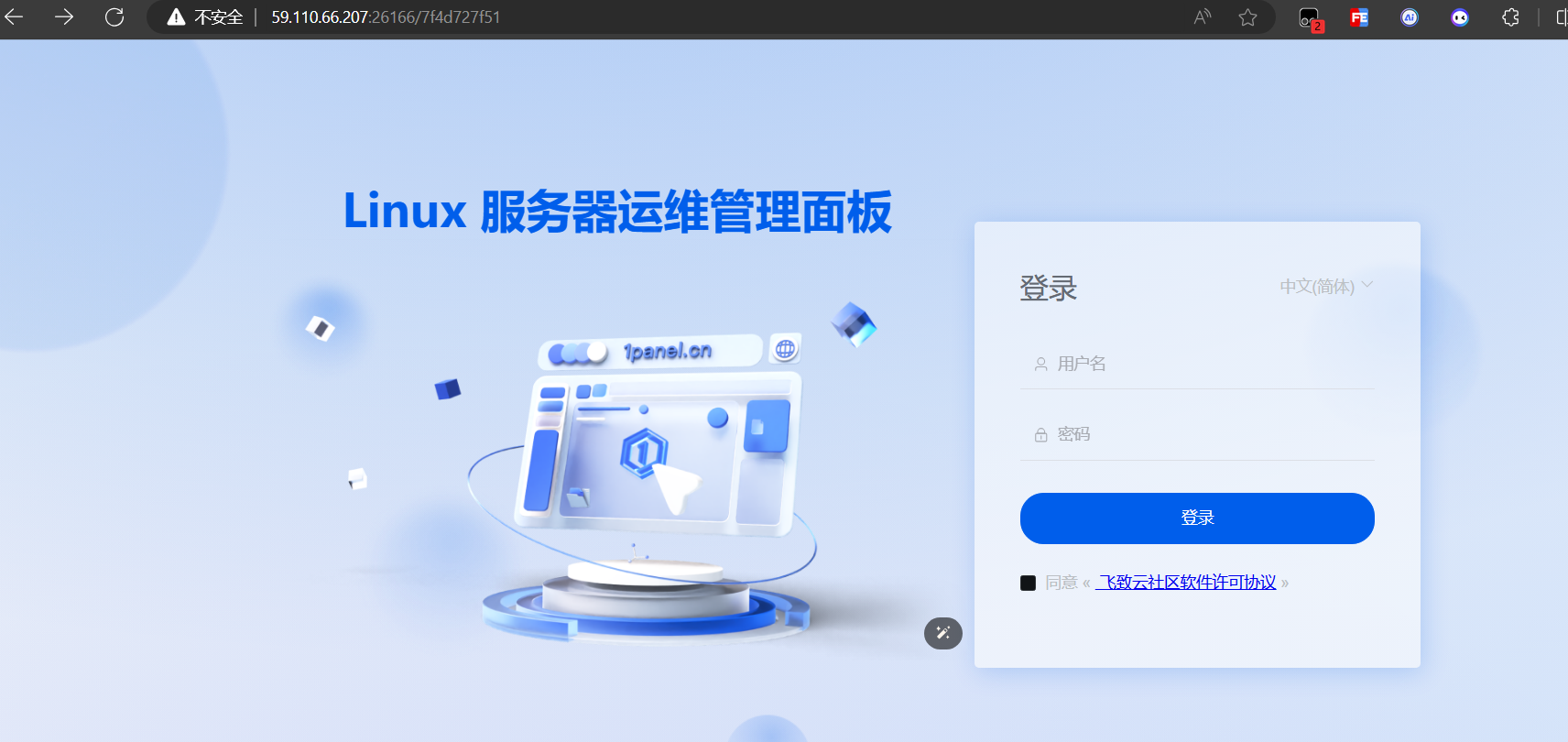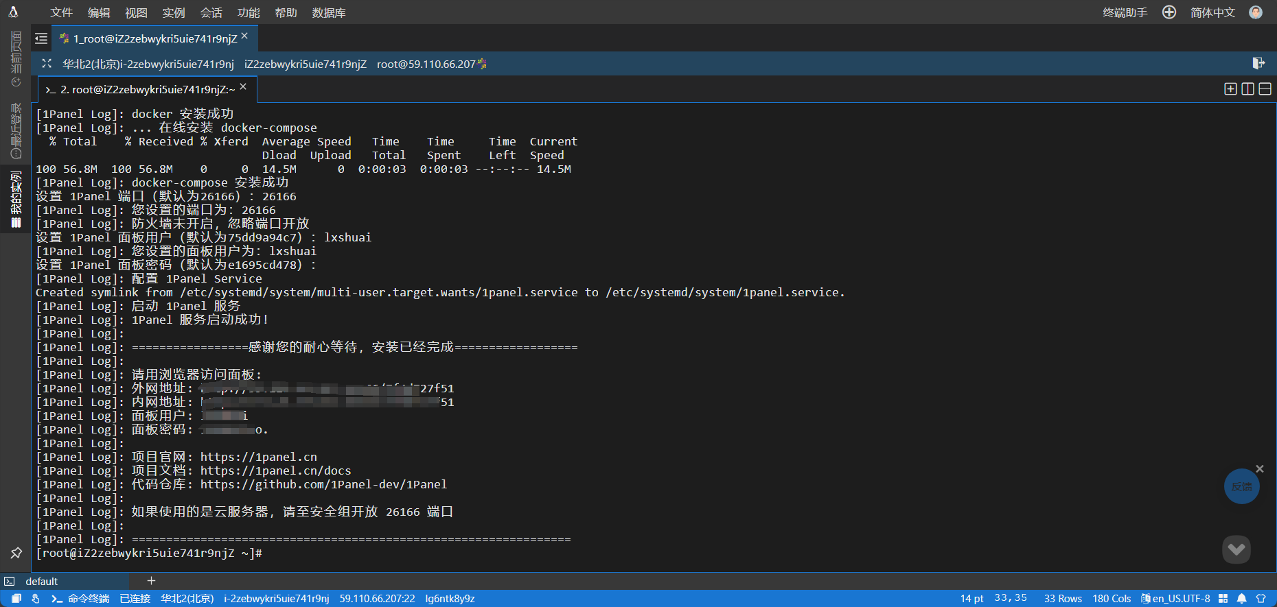 - 安装成功后,控制台会打印面板访问信息,可通过浏览器访问 1Panel