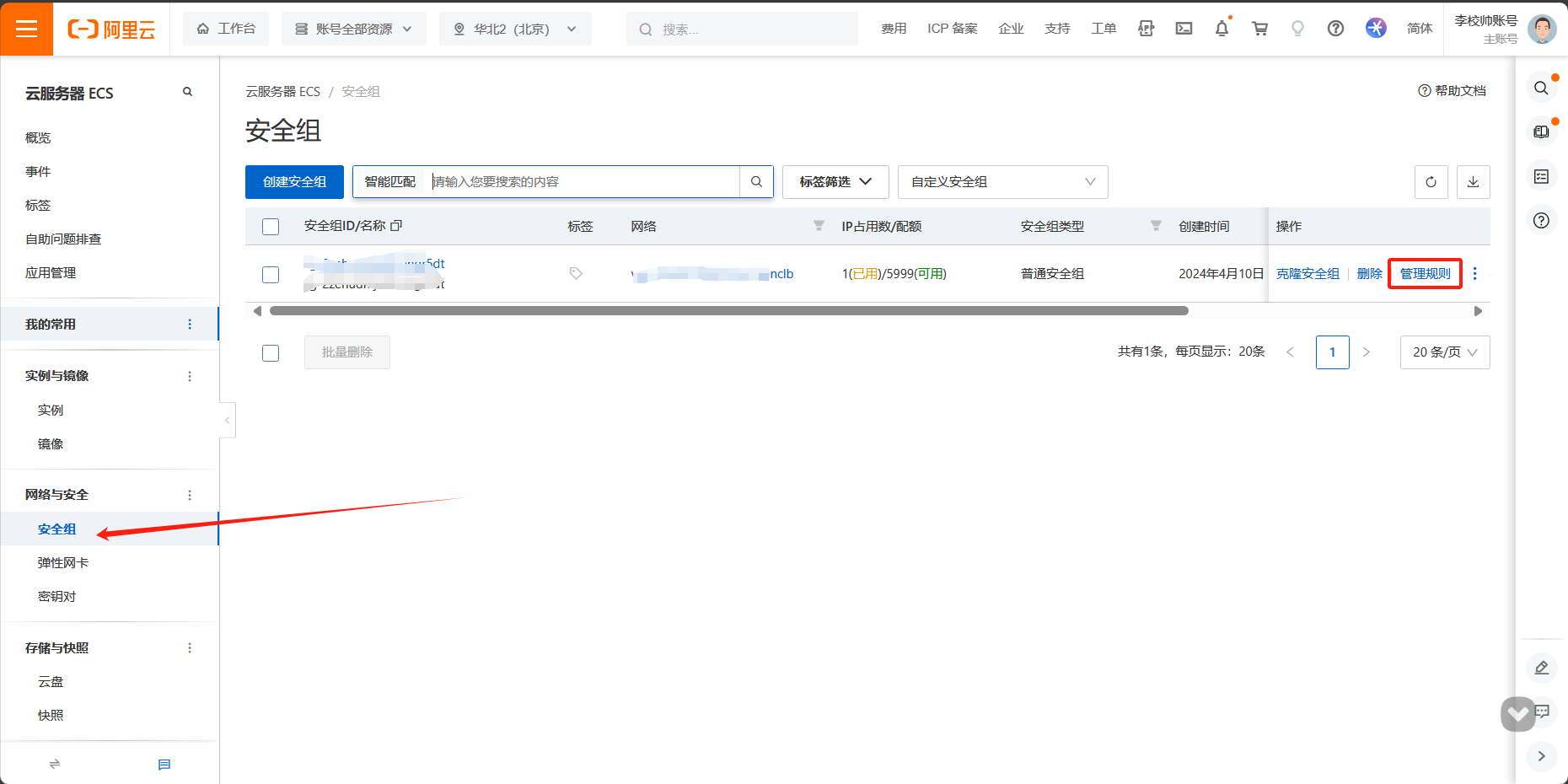 - 在左侧导航栏,选择网络与安全 > 安全组,单击管理规则