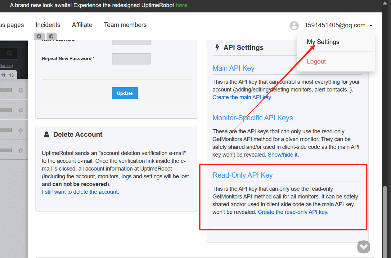 My Settings页面获取 类型为Read-Only API Key的API Key